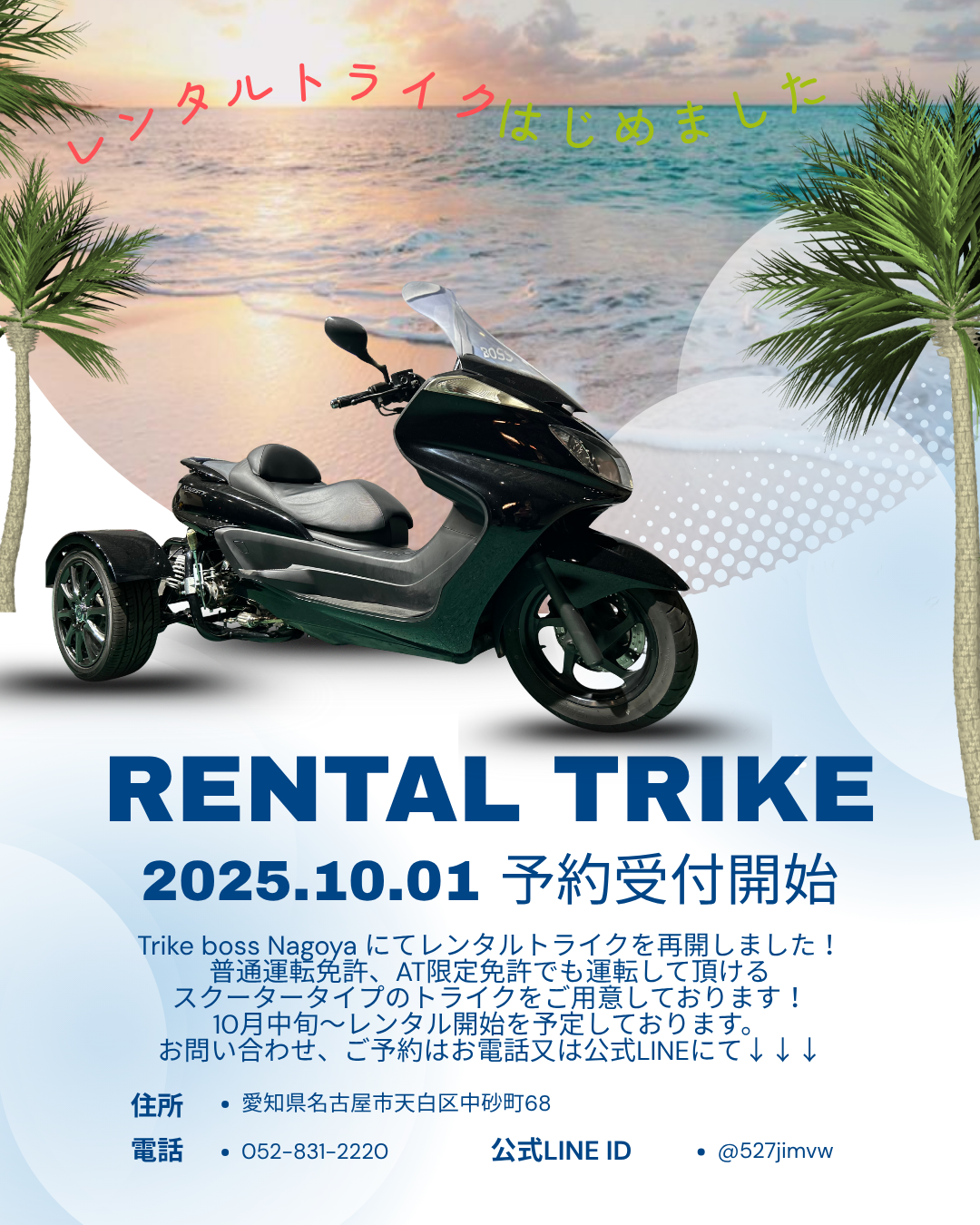 2025年10月01日より レンタルトライクの予約受付を開始しました。 レンタル開始時期は、10月中旬~を予定しております。